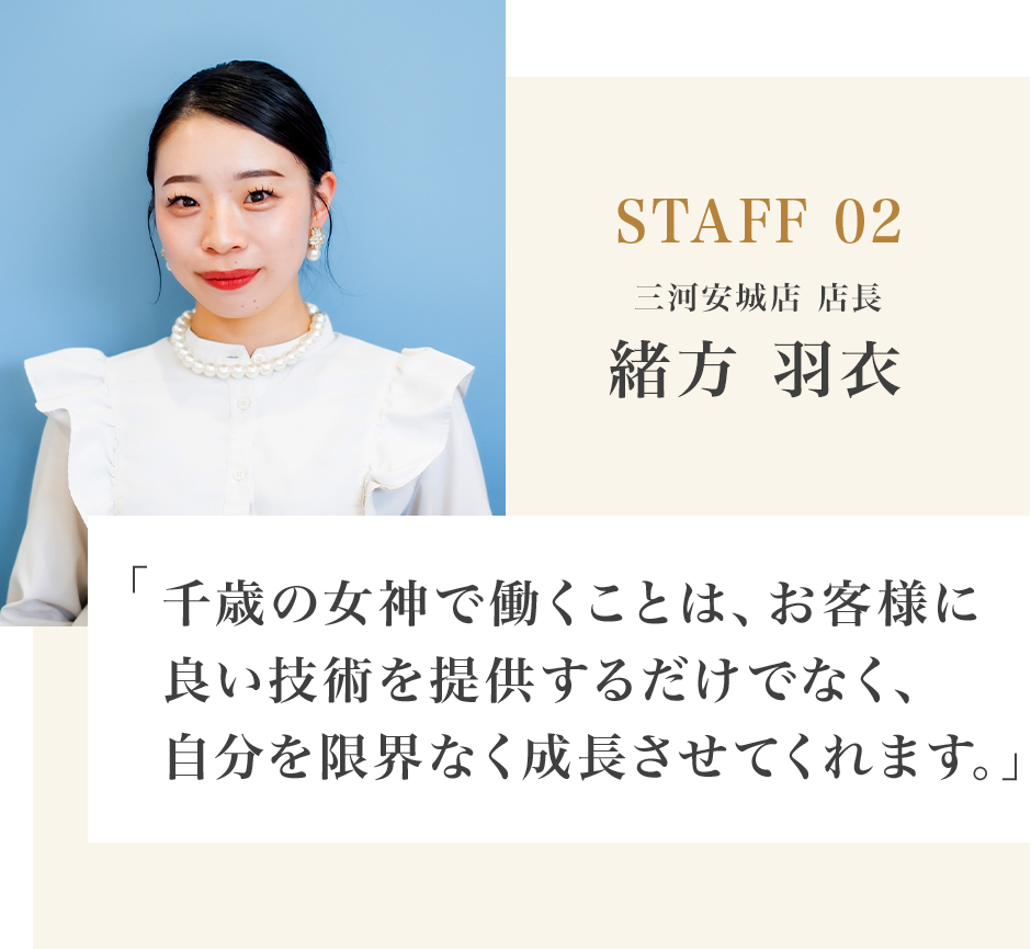 そして千歳の女神で働くことは、お客様に良い技術を提供するだけでなく、自分を限界なく成長させてくれます。